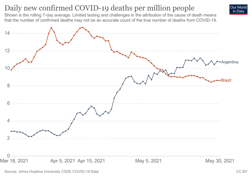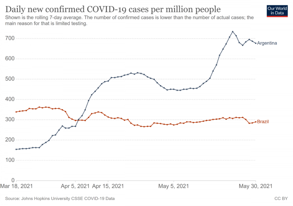 plavayen Posted May 31, 2021 Posted May 31, 2021 (edited) hace 4 minutos, catorivadero dijo: en estos momentos que sería? en los últimos días, semanas, meses? La gráfica que enlace y que me parece que no viste te responde la pregunta... Desde el 6 de abril Argentina tiene mas casos/millón de habitantes que Brasil, por lo tanto desde esa fecha hay mas nivel de contagio en Argentina que en Brasil. Edited May 31, 2021 by plavayen 3
