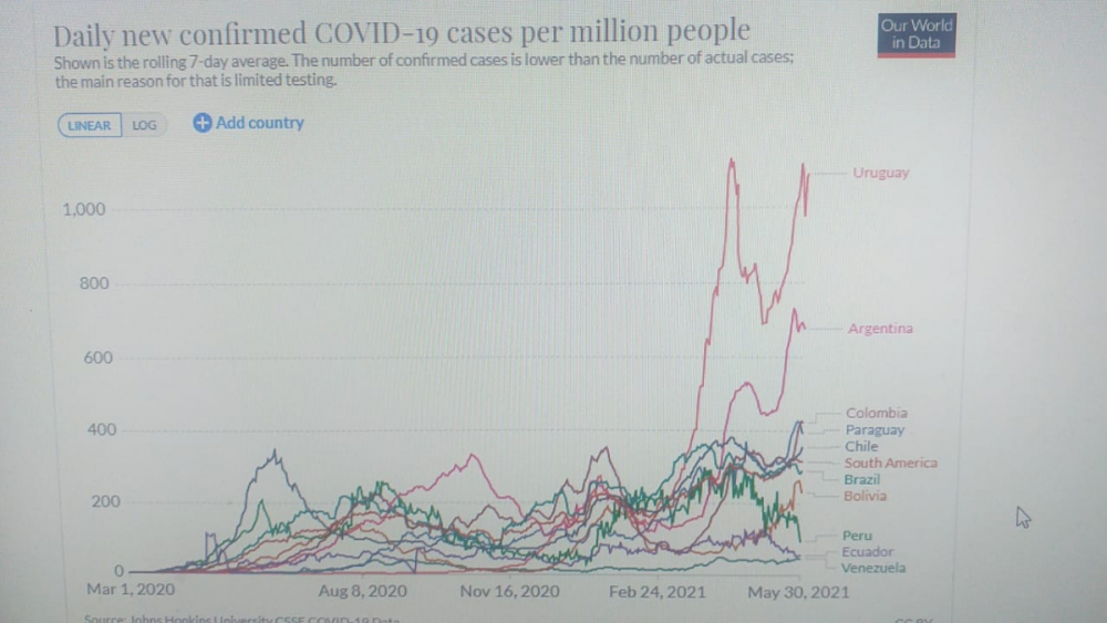 plavayen Posted May 31, 2021 Posted May 31, 2021 (edited) hace 1 hora, catorivadero dijo: Cualquiera. No debería jugarse para mi, o que la hagan en Estados Unidos que te podes vacuna en el kiosco de revistas y al carajo. No la hacen acá por el coronavirus y la hacen en el país mas afectado del continente, cualquiera. Brasil en este momento esta mejor a nivel de contagios y muertes que casi todo el resto de sudamérica. Perú, Bolivia y Ecuador podrían ser mejores opciones que Brasil si fuera solo por la pandemia. https://ourworldindata.org/explorers/coronavirus-data-explorer?zoomToSelection=true&time=2020-03-01..latest&pickerSort=asc&pickerMetric=location&Metric=Confirmed+cases&Interval=7-day+rolling+average&Relative+to+Population=true&Align+outbreaks=false&country=ARG~BRA~URY~PRY~PER~BOL~ECU Edited May 31, 2021 by plavayen
