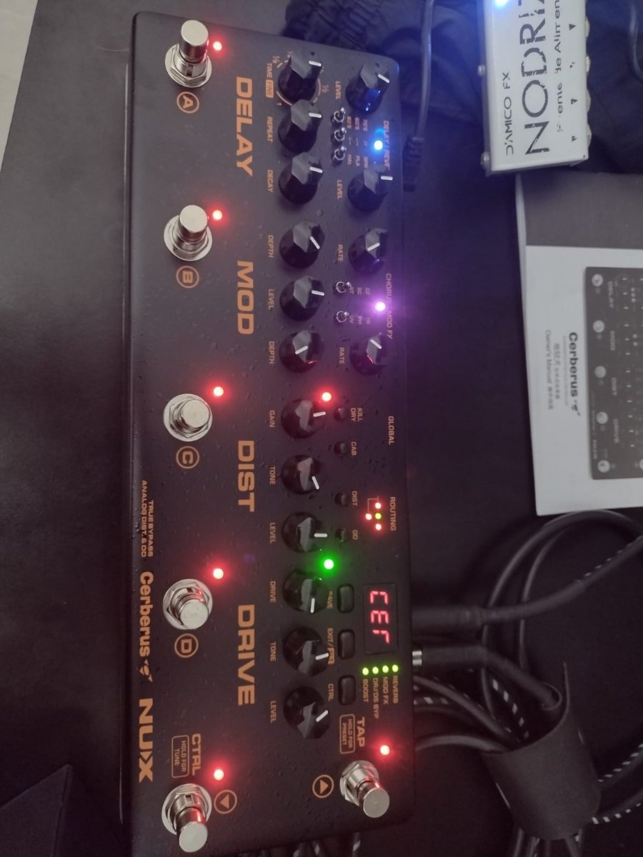 Nahue.tdg Posted July 14, 2021 Posted July 14, 2021 Hola, que tal amigos? Me compre hace poquito una NUX Cerberus y hoy llego. La cuestion es que me sente, conecte todo como dice el manual y demas y se quedo con absolutamente todas las luces prendidas (muestro foto) y no cargaba ningun efecto por mas que aprete el switch, se quedaba igual. Al rato se puso todo ok y la pude probar, excepto el chorus y delay que apretaba y no sonaban, y enseguida se prendieron todas las luces de nuevo y la viola empezo a sonar clean otra vez. Tengo una fuente Nodriza que la verdad es que como venia usando una multifx no la uso hace mucho la fuente y tengo la duda de que quizas ese sea el problema porque estaba haciendo como una especie de silvido muy muy bajito la nodriza y los leds de la cerberus titilaban de a momentos. Mi consulta es, es normal ese comportamiento de la NUX, o se puede deber a que ande mal mi fuente? En caso de ser asi hay forma de constatar que realmente anda mal? La pregunta va mas que nada a usuarios de Cerberus que tengan mas experiencia que yo obviamente que pude tocar 5 cosas y no me funciono jajaja Gracias desde ya!! Quote