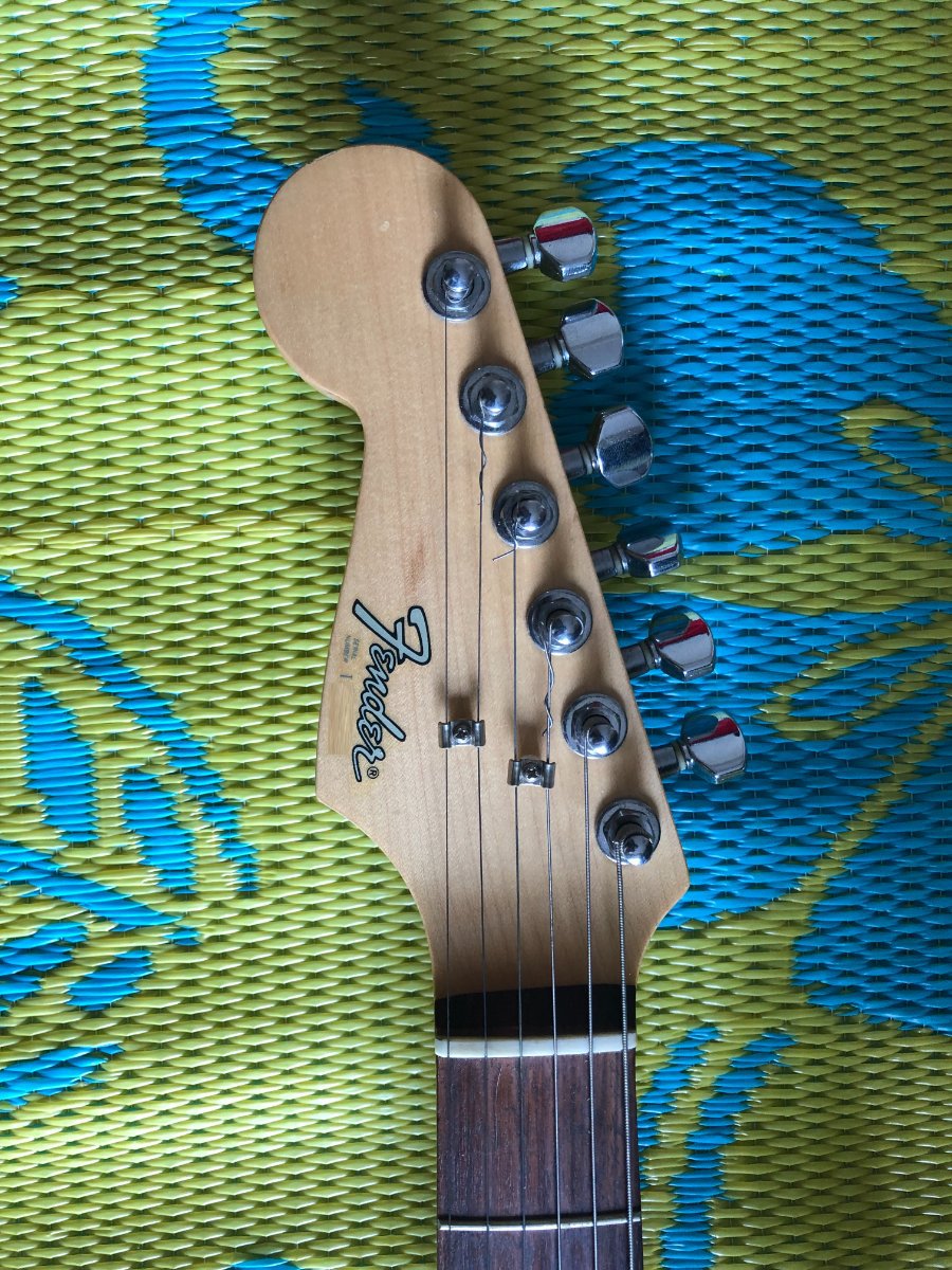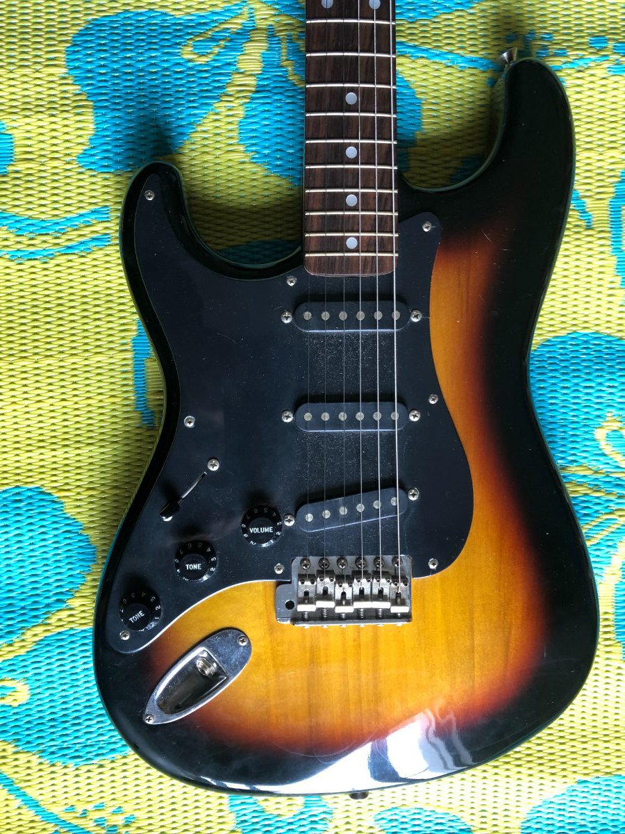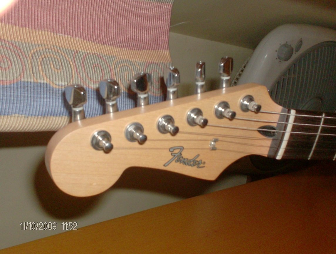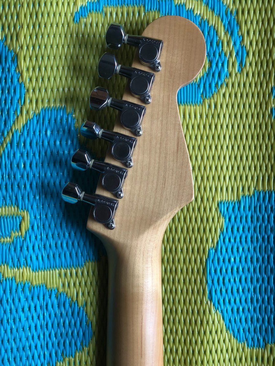 FABIAN M Posted July 24, 2021 Posted July 24, 2021 A mediados de los noventas habían acá pocas guitarras zurdas, y habían unas Fender que venían blancas o sunburst con el pickguard negro. Yo que soy zurdo tenía la blanca, pero el pickguard era de tres capas. Las clavijas eran Gotoh, acá en la foto no alcanzo a leer, y el logo era así, no decía Stratocaster, pero el mango era distinto, y el serial si mal no recuerdo estaba atrás de la pala. Casi no tengo fotos de mi guitarra, es una lástima. Esta es una de las pocas fotos que tengo. Es distinta a la de las fotos de acá. 1 Quote