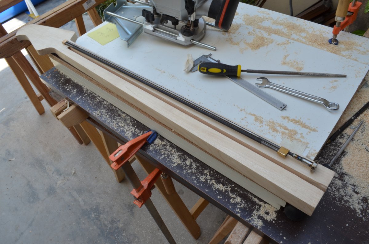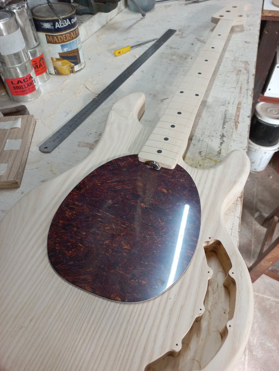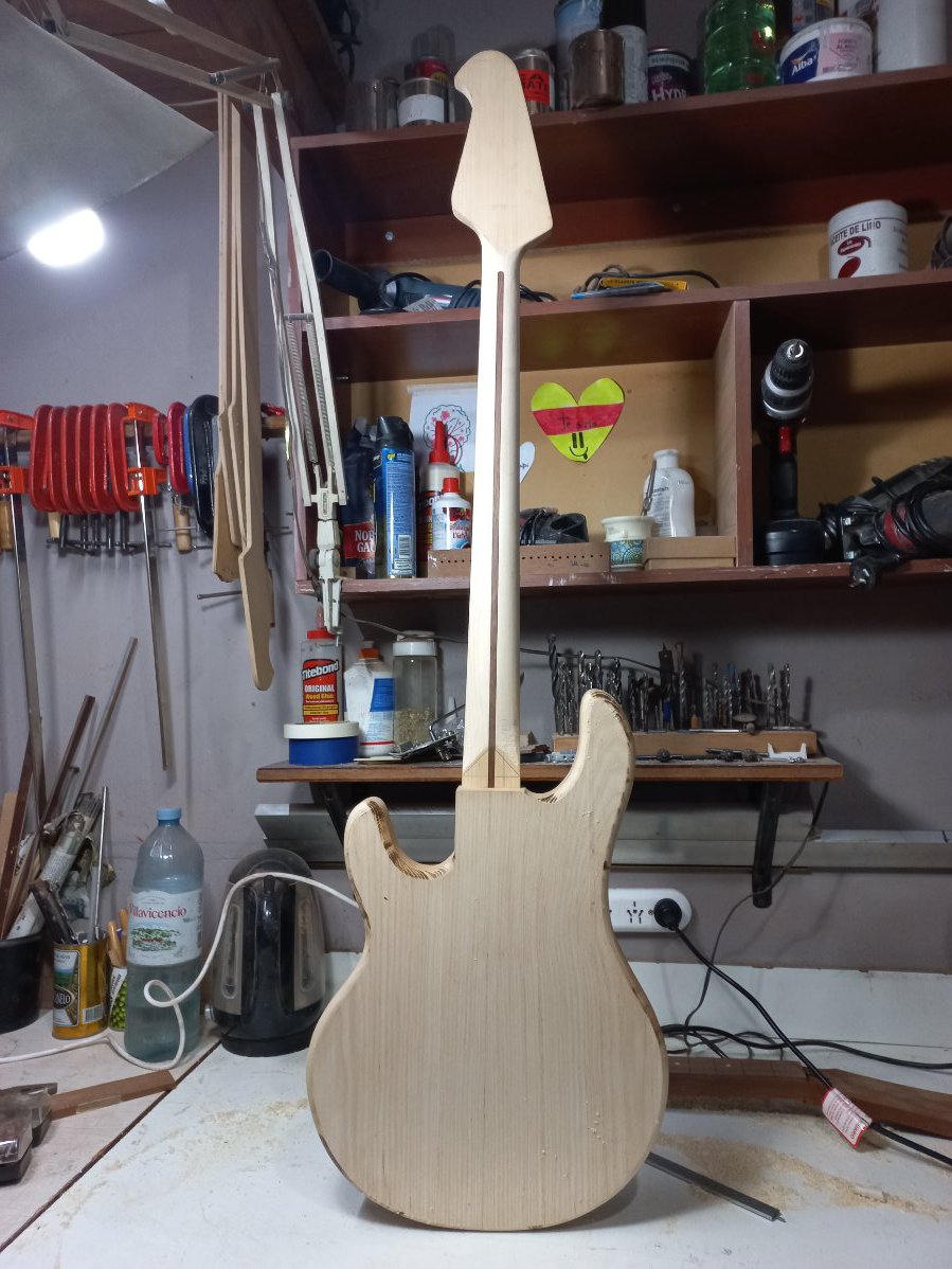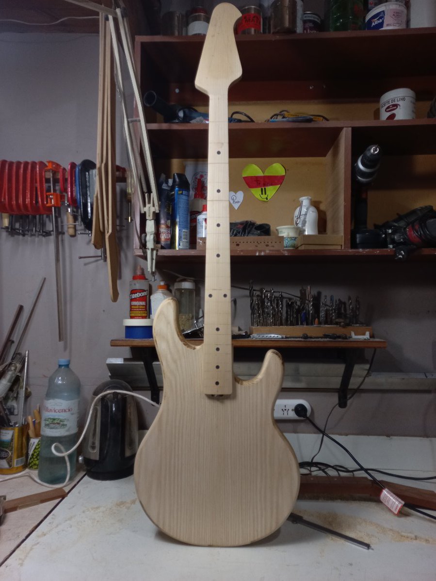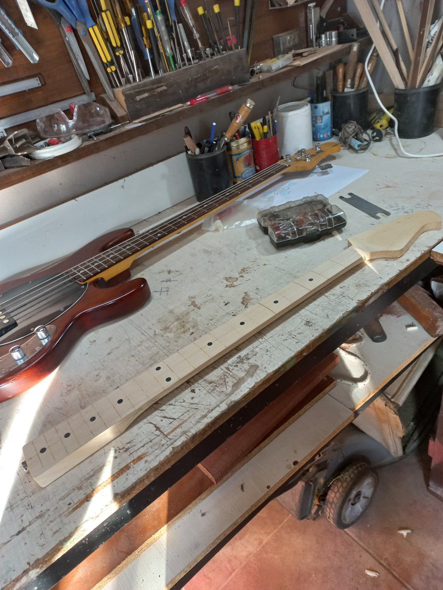 Popular Post diego dominguez Posted December 15, 2021 Popular Post Posted December 15, 2021 (edited) Acá traigo otro proyecto retrasado de hace unos años. Un bajo estilo Musicman Stingray…Es mi primer “bajo eléctrico” y también mi primer instrumento para un tercero “mi hermano”. El proyecto arrancó en 2014 junto a la “Jazzmaster verde botella” (ambos mástiles fueron sacados del mismo tablón de maple super radial) y lo suspendí por falta de conocimientos sobre bajos y hoy a fines del 2021 mas confiado lo retomo. Por suerte mi hermano siempre me bancó y nunca me metió presión...ayer le mostré los avances y le brillaban los ojitos...jajaja. Es muy difícil tomar decisiones sobre las maderas compradas por otros cuando uno no se dedica profesionalmente a esto…jajaja. En las fotos hay cosas que a la distancia me resultaron graciosas de como intentaba resolver ciertos procesos… Espero que guste. Tablón de maple (ahí está el mástil de la jazzmaster verde botella.) Fresno (del pesado)...se cortó en espejo... en aquel momento no podía conseguir esa ruedita con los agujeros por lo que mi hermano lo mandó a hacer a un tornero...quedó bastante bien. tampoco tenía banco para trabajar y armaba caballetes. la costilla es de nogal como debe ser... Edited December 15, 2021 by diego dominguez 10 Quote