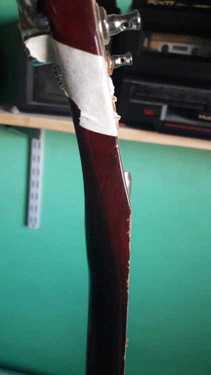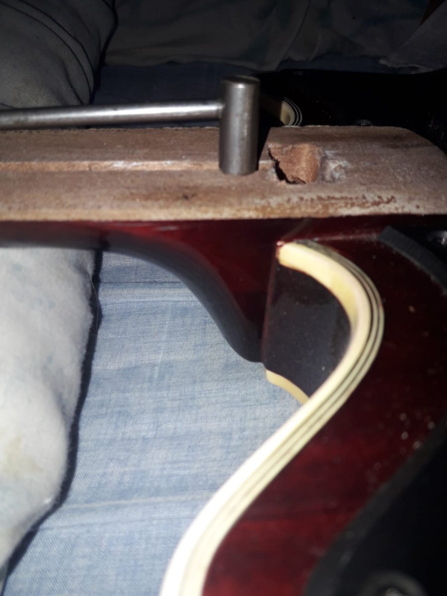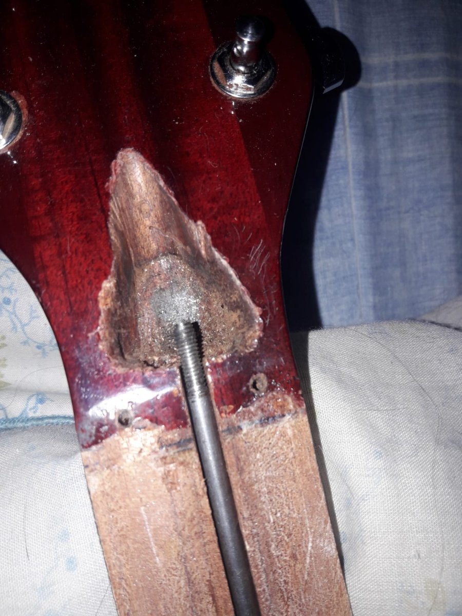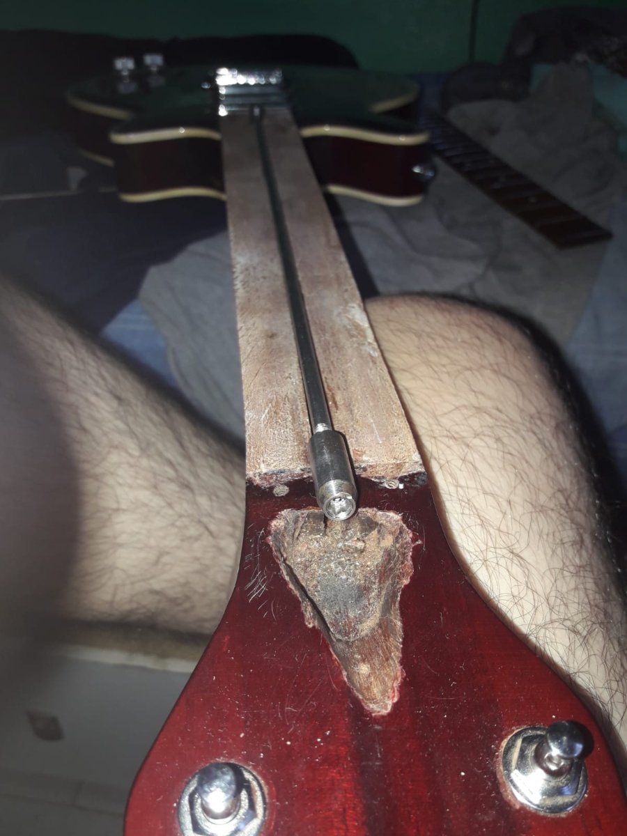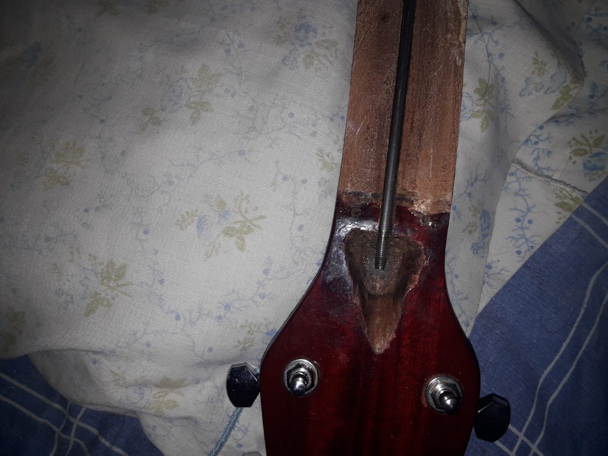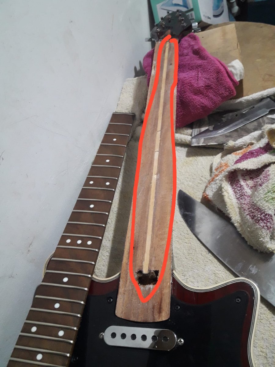 Laier Posted January 29, 2023 Author Posted January 29, 2023 hace 1 hora, tupac dijo: ¿Ya sacaste la madera que tapa el canal? ¿El canal es curvo o recto? ¿Qué profundidad tiene? Viendo la foto, si el alma que llegarás a usar fuera un poco más larga no tendrías problema porque hay madera en el talón. Lo otro que te pregunto son mayores condicionantes para saber si podés optar por un alma doble acción o colocarle otra alma simple acción. PD: cuando vuelvas a pegar el diapasón, un truquito bueno es sacarle dos trastes (alguno de los primeros y alguno de los últimos), presentar el diapasón, y hacer dos perforaciones en cada canal de los trastes para pasar clavos que lo retengan al momento de volver a pegarlo. Con que la punta de los clavos penetren 3 mm está bien, no te afecta la estabilidad del mástil y es una práctica archi conocida. Yo lo suelo hacer cada vez que pego un diapasón ya ranurado. Una vez que secó, le sacás los clavitos, y volvés a colocar los trastes. No antes que seque, porque por más presión que hagas, puede llegar a moverse igual (true story). Buenas! Si, ya le saque la madera esa. El canal es mas o menos curvo, tiene curvatura justo en el centro. Que medida queres saber? la profundidad en el centro o en los extremos? Quote