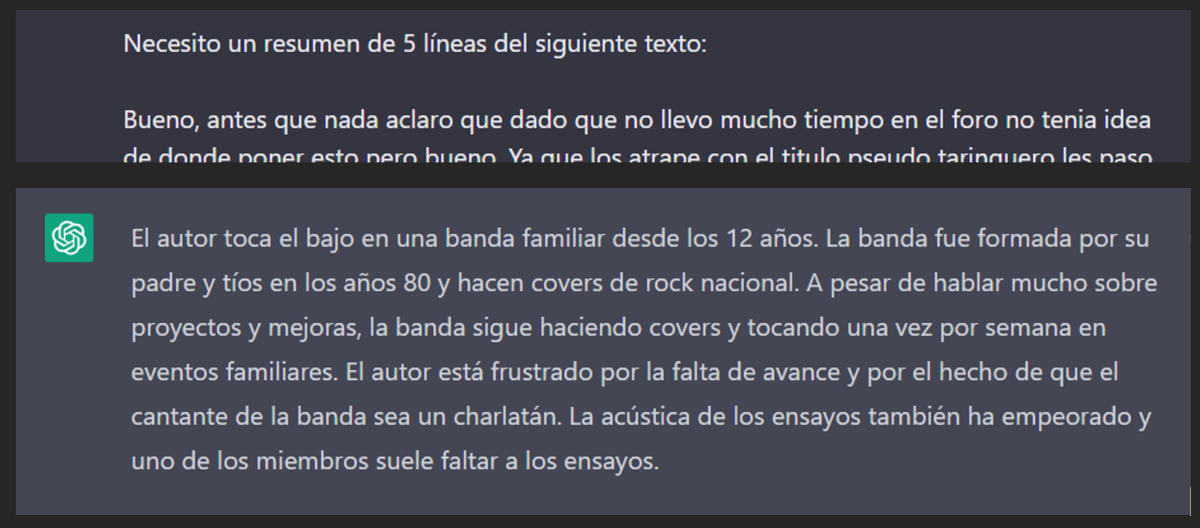 MusicFotoArt Posted February 11, 2023 Posted February 11, 2023 (edited) La IA de arriba te lo resumó en 6 lineas y te dió una sugerencia en 7 lineas mas; yo te lo resumo en una sola........ Sali de ahi Maravilla, armá rancho con tu primo el tecladista, se buscan un batero y un violero y banda nueva. Las relaciones tóxicas solo aportan algo al tóxico. Te lo dice alguien que, por diferencia generacional, podria ser tu viejo, pero esas situaciones no tienen edad, cuando no funcionan, hay que salir. Pensá que, cuando vos estas yendo, ellos están de vuelta y las espectativas son bien diferentes. PD: para la próxima, poné unos punto aparte y espacios entre lineas, sino, leer ese texto termina siendo mas embolante que tocar covers en un grupo con el padre, el amigo y los tios. Vá con onda. Edited February 11, 2023 by MusicFotoArt Quote