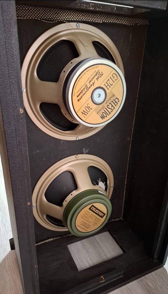 Lo tengo en una Marshall 2x12 1966a vertical con un greenback. H30 abajo y GB arriba. Lo tuve tambien en una Shenier 2x12 horizontal con un Greenback. Lo probe con un Plexi 50w, un Shenier Antares y un Prs Archon. Comparte el mismo cono 1777 que el greenback pero con imán H. Suena mucho mas al frente, mucho mas agudo y apretado que el Greenback. Agrega un brillito extra y hace que nunca se sienta la caja o ampli como si tuviera una frazada encima. Muchos en foros o youtube hablan pestes por lo agudo que suena , que el break es eterno. Es el parlante que viene en las cajas EVH 2x12 y en muchos combos boutique tipo Dr. Z. Supuestamente por specs vendría a ser un Blackback de los 70s pero sin el plástico negro que cubre el imán H, cono Kurt Muller (1777). Más agresivo que un Greenback H de los 60s. -